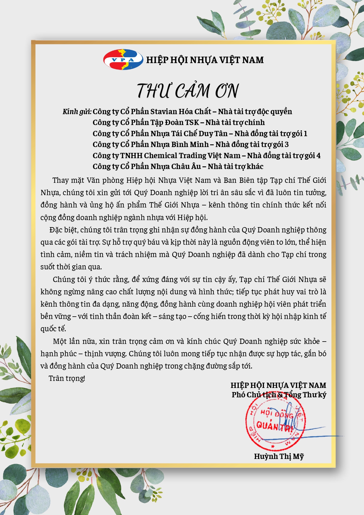 Thư Cảm ơn các công ty Tham gia tài trợ Quảng cáo truyền tải thông tin, thành tựu của Doanh nghiệp trên Tạp Chí Thế Giới Nhựa