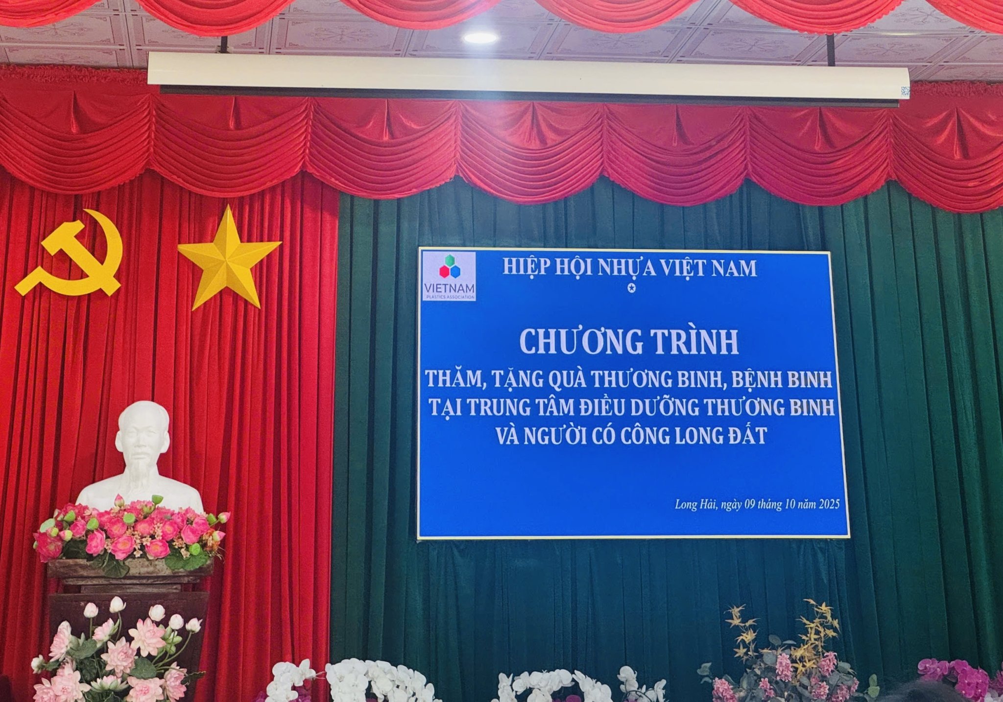 Ngày 09/10/2025 - Với thông điệp “Tri ân thế hệ đi trước & lan tỏa tinh thần uống nước nhớ nguồn”, Hiệp hội Nhựa Việt Nam (VPA) đã tổ chức chương trình thăm hỏi, tặng quà cho các thương binh, bệnh binh tại Trung tâm Điều dưỡng Thương binh và Người có công (NCC) Long Đất tại xã Long Hải, Thành phố Hồ Chí Minh. Đây là một trong những hoạt động nhân văn nằm trong chuỗi sự kiện kỷ niệm 35 năm thành lập Hiệp hội, thể hiện tinh thần tri ân và trách nhiệm xã hội của cộng đồng doanh nghiệp ngành nhựa, hướng đến tri ân, sẻ chia yêu thương với những người có công với Tổ quốc.