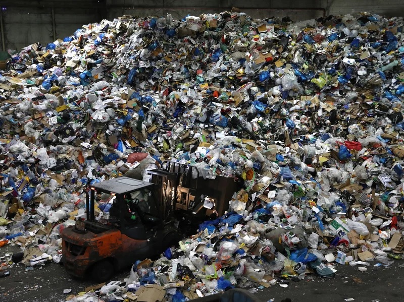 Một công nhân vận hành xe nâng để di chuyển rác thải sinh hoạt tại cơ sở lưu trữ vật liệu tái chế ở Seoul, Hàn Quốc. Ảnh: Getty Images.