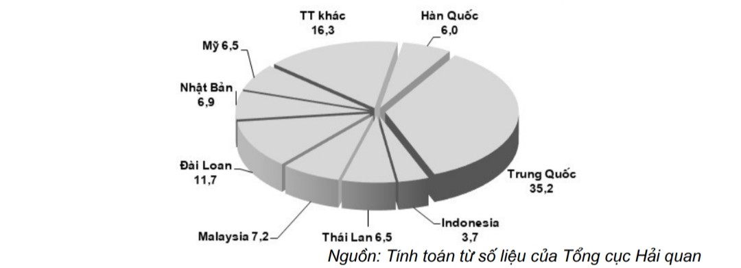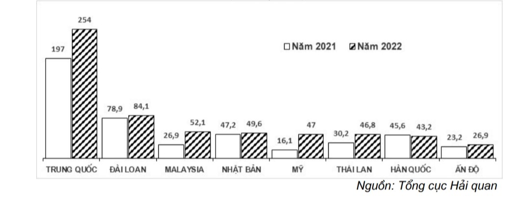 Kim ngạch nhập khẩu hóa chất từ thị trường Đài Loan tháng 8/2022 giảm 21,8% so với tháng 7/2022, đạt 84,1 triệu USD và chiếm tỷ trọng 11,7% tổng kim ngạch nhập khẩu hóa chất của Việt Nam. Vinyl chloride monomer, Mono ethylene glycol, Toluene, Canxi carbonate là những mặt hàng được nhập nhiều từ thị trường này.