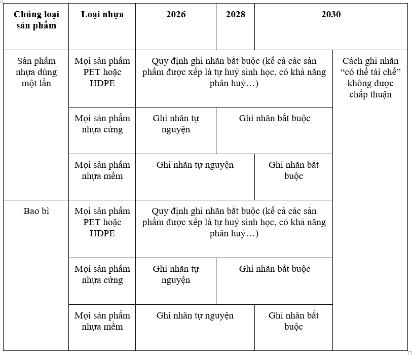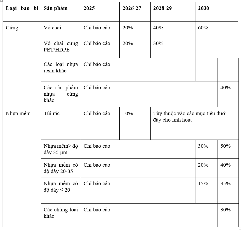 Quy định cụ thể về hàm lượng tái chế đối với từng loại sản phẩm và mốc thời gian: