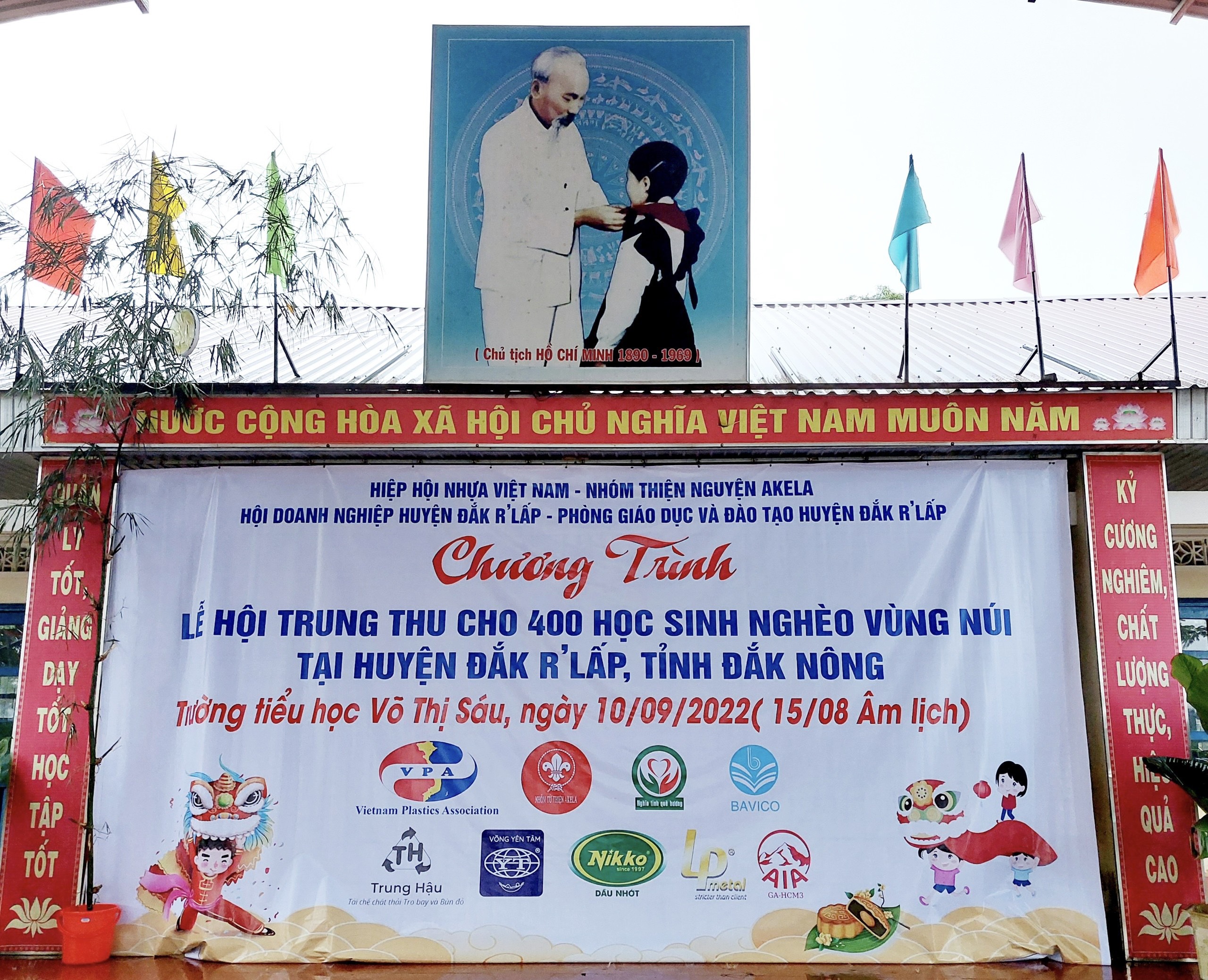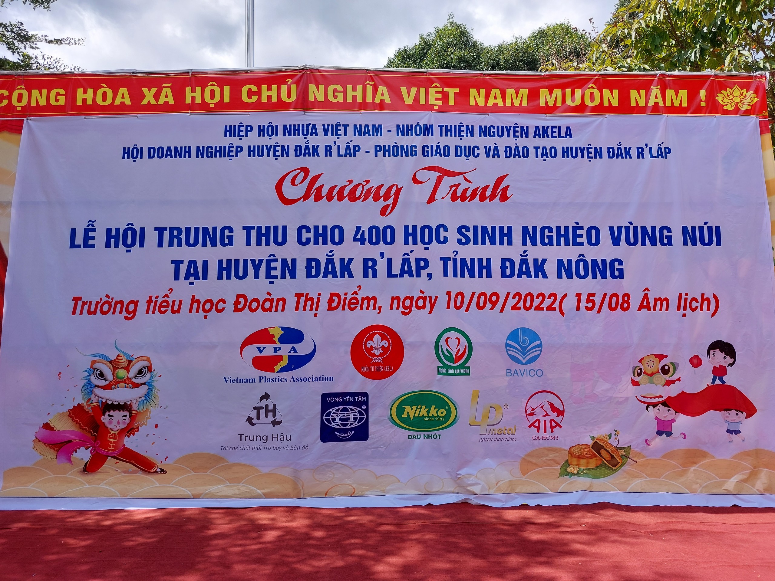Ngày 10-9-2022 vừa qua, Ban từ thiện Hiệp hội nhựa Việt Nam, Nhóm thiện nguyện Akela, Hội Doanh nghiệp Đắk R’Lấp đã phối hợp trao tặng 400 phần quà (trị giá mỗi phần khoảng 300 ngàn đồng) với tổng trị giá 120 triệu đồng cho các em học sinh nghèo có Tết trung thu ý nghĩa và ấm áp tại 3 điểm trường tiểu học ở vùng núi thuộc huyện Đắk R’Lấp, tỉnh Đắk Nông.